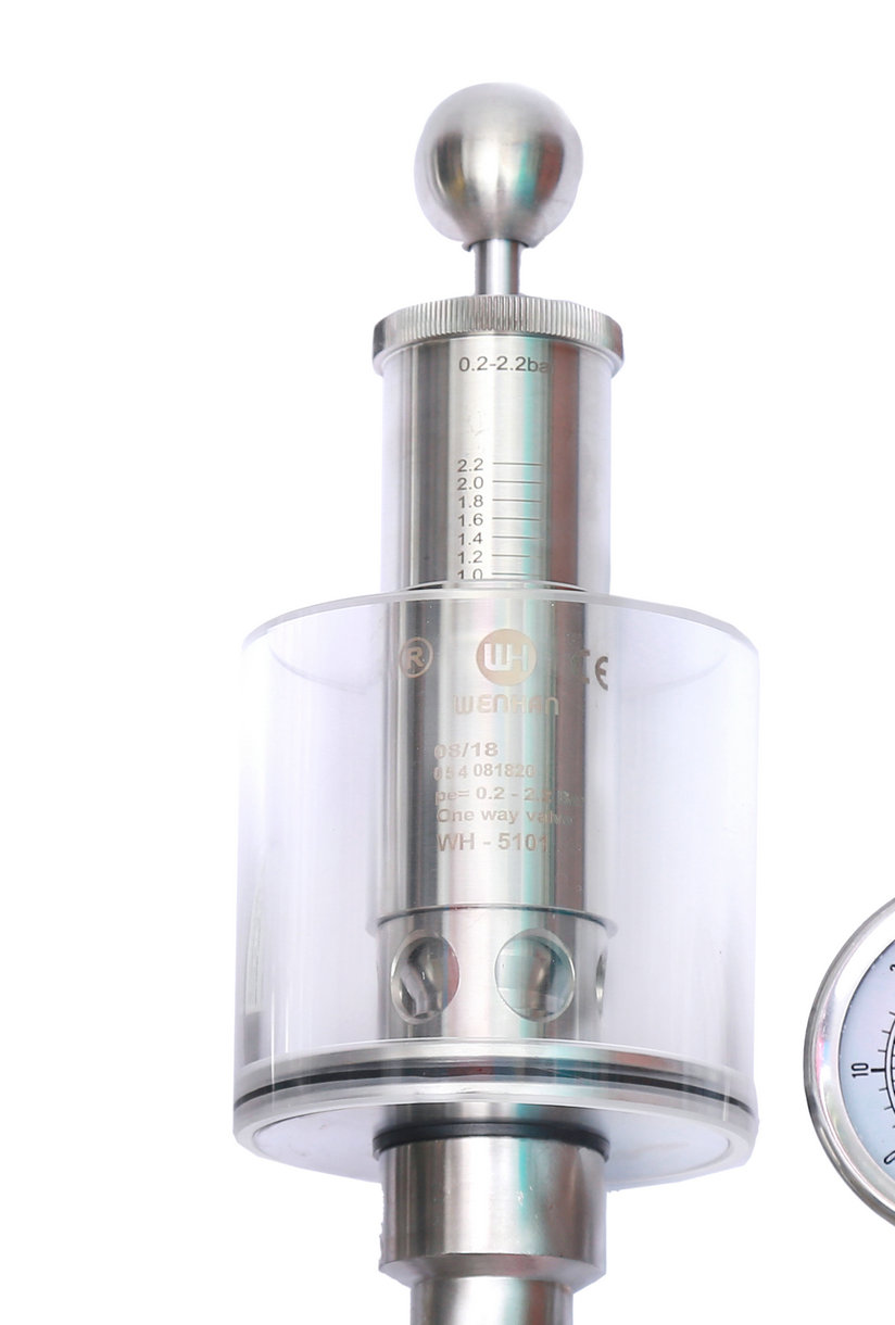 調節(jié)單向排氣閥保護容器壓力過高防爆作用,當壓力高于設定壓力(標準1BAR)時可以排氣,反之關閉,調節(jié)桿標上壓力刻度,所需壓力按刻度上調整,該閥門使用方便,刻度準確,玻璃罩加水能看到發(fā)酵效果,減少染菌。同時也可以滿足于各種生產(chǎn)工藝需求,適用于各種食品加工,啤酒,飲料以及制藥等各種工業(yè)領域。